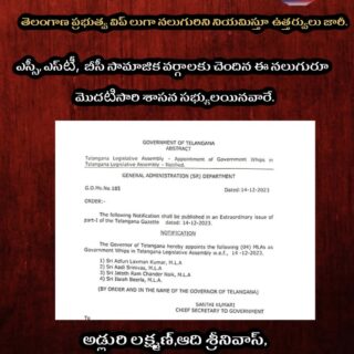 తెలంగాణ ప్రభుత్వ విప్ లుగా నలుగురిని నియమిస్తూ ఉత్తర్వులు జారీ. ఎస్సీ, ఎస్టీ, బీసీ సామాజిక వర్గాలకు చెందిన ఈ నలుగురూ మొదటిసారి శాసన సభ్యులయినవారే. అడ్లురి లక్ష్మణ్, ఆది శ్రీనివాస్, జటోత్ రామచంద్ర నాయక్, బీర్ల అయిలయ్య.