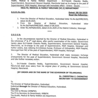 జ్ఞానతెలంగాణ,హైదరాబాద్ : తెలంగాణ ప్రభుత్వం వైద్య, ఆరోగ్య మరియు కుటుంబ సంక్షేమ శాఖలో కీలక నియామకం చేపట్టింది. మంచిర్యాల ప్రభుత్వ జనరల్ హాస్పిటల్ సూపరింటెండెంట్ డాక్టర్ పి. హరీష్ చంద్ర రెడ్డిను వరంగల్ ఎంజిఎం (MGM) హాస్పిటల్ సూపరింటెండెంట్గా ఇన్ఛార్జ్గా ప్రభుత్వం నియమించింది. ఈ నియామకం తక్షణమే...