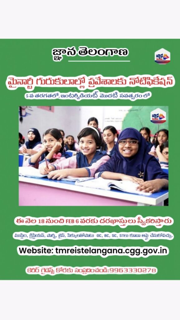 TS: మైనార్టీ గురుకుల విద్యా సంస్థల్లో ప్రవేశాలకు నోటిఫికేషన్ ను విడుదల చేసారు. రేపటి నుండి FEB 6 వ తేదీ వరకు దరఖాస్తులు ఆన్లైన్ లో స్వీకరిస్తారు. 204 స్కూళ్లలో ఐదో తరగతిలో అడ్మిషన్స్ కోరకు ముస్లిం, క్రిస్టియన్, పార్శీ, జైన్, సిక్కులతోపాటు OC, BC, SC, STలు కూడా అప్లై చేసుకోవచ్చు. అలాగే 194 జూనియర్ కాలేజీలు, 10 COE ప్రతిభ కళాశాలలకాలేజీల్లో ఇంటర్ ఫస్ట్ ఇయర్కు కూడా దరఖాస్తులు స్వీకరిస్తారు.Website: tmreistelangana.cgg.gov.in