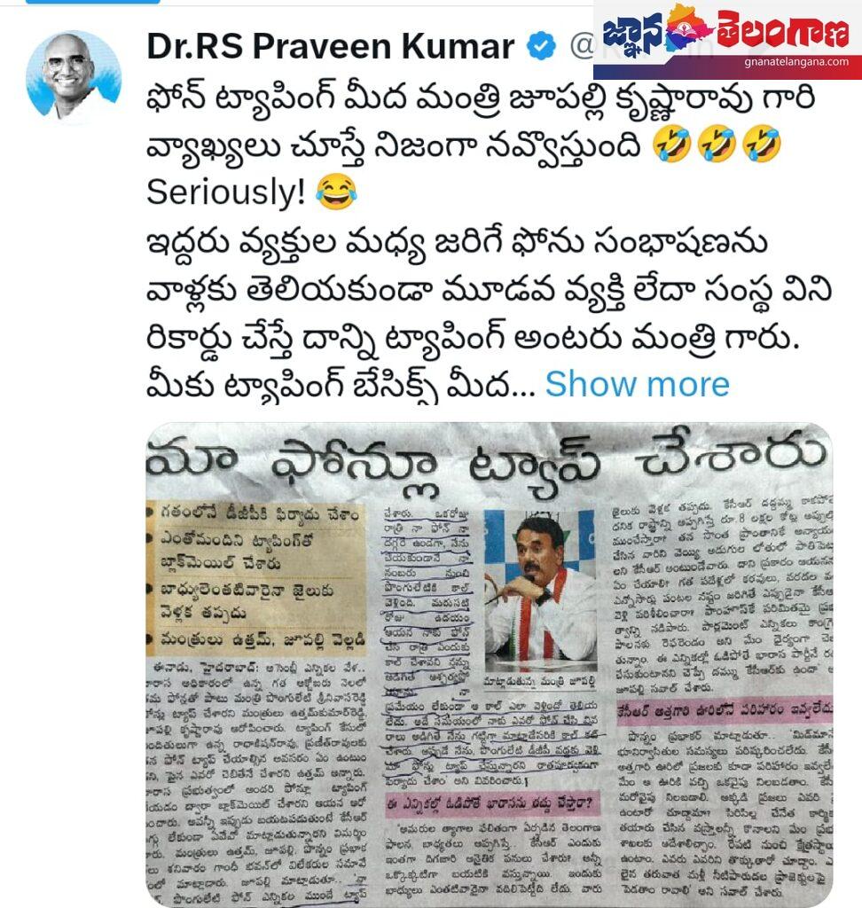 ఫోన్ ట్యాపింగ్ మీద మంత్రి జూపల్లి కృష్ణారావు గారి వ్యాఖ్యలు చూస్తే నిజంగా నవ్వొస్తుందాని X వేదికగా స్పందించారు .