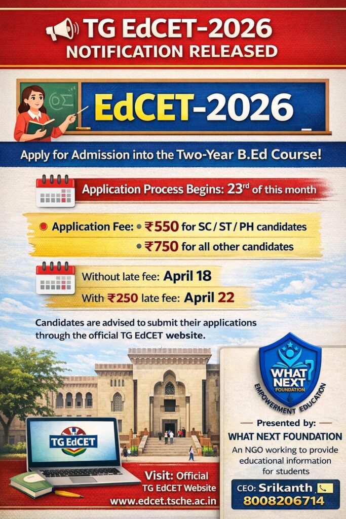 రెండేళ్ల బీఈడ్ (ఉపాధ్యాయ విద్య) కోర్సుల్లో ప్రవేశాల కోసం నిర్వహించే టీజీఎడ్సెట్-2026 నోటిఫికేషన్ విడుదలైంది. ఈ విషయాన్ని సెట్ కన్వీనర్ ఆచార్య వెంకట్రాంరెడ్డి శుక్రవారం విడుదల చేసిన ప్రకటనలో తెలిపారు. రాష్ట్రవ్యాప్తంగా ఉన్న విద్యార్థులు ఈ ప్రవేశ పరీక్ష ద్వారా బీఈడ్ కోర్సులో చేరే అవకాశం పొందనున్నారు.
