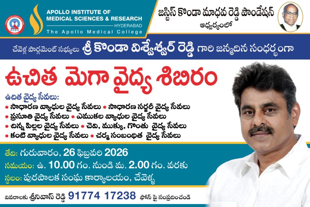 చేవెళ్ల పార్లమెంట్ సభ్యులు శ్రీ కొండా విశ్వేశ్వర్ రెడ్డి గారి జన్మదినాన్ని పురస్కరించుకొని ప్రజల ఆరోగ్య సంక్షేమం దృష్ట్యా ఉచిత మెగా వైద్య శిబిరాన్ని నిర్వహిస్తున్నారు. ఈ శిబిరం ద్వారా వివిధ రంగాల నిపుణులైన వైద్యులు సేవలు అందించనున్నారు. ప్రజలు ఈ అవకాశాన్ని వినియోగించుకుని ఉచితంగా వైద్య పరీక్షలు చేయించుకోవచ్చు.
