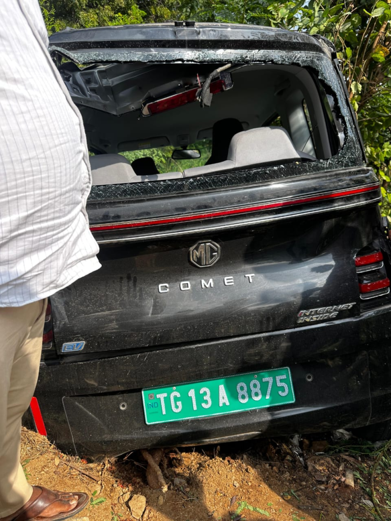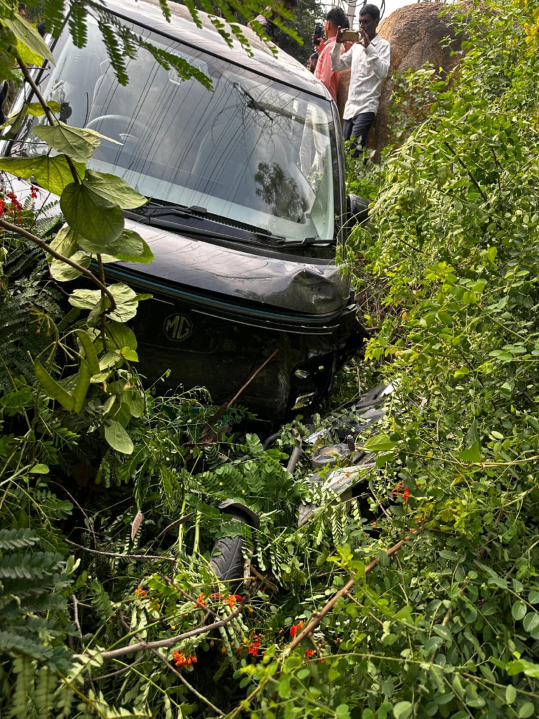 అదే సమయంలో ఎదురుగా రోడ్ పక్కన ఆగి వున్న బైక్ను బలంగా ఢీకొట్టింది, ఆ ధాటికి బైక్ పై ఉన్న క్రింద పడిపోగా, కారు మరింత ముందుకు దూసుకెళ్లి, రోడ్డు పక్కన ఉన్న చెట్ల పొదల్లోకి పడిపోయింది,ప్రమాద తీవ్రతకు కారు ముందు వెనక భాగం పూర్తిగా నుజ్జునుజ్జు అయింది,