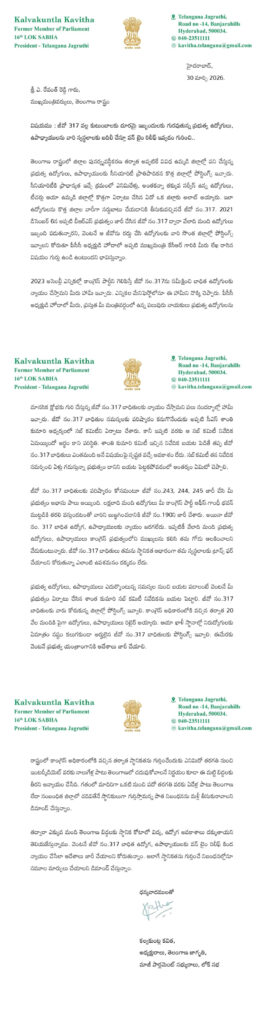 ఇక స్థానికతను నిర్ణయించే నిబంధనల్లో కూడా సమూల మార్పులు అవసరమని కవిత అభిప్రాయపడ్డారు. ఉద్యోగులు, ఉపాధ్యాయుల సమస్యలను దృష్టిలో పెట్టుకుని ప్రభుత్వం తక్షణ చర్యలు తీసుకోవాలని కోరారు. జీవో 317 బాధితులకు న్యాయం జరిగేలా స్పష్టమైన నిర్ణయం తీసుకోవాలని ఆమె లేఖలో విజ్ఞప్తి చేశారు.