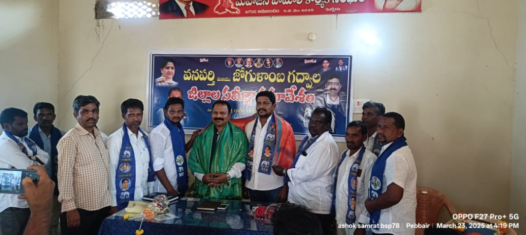 జోగులాంబ : పెబ్బేరు మండల కేంద్రంలో ఆదివారం బహుజన్ సమాజ్ పార్టీ ఆధ్వర్యంలో ముఖ్య కార్యకర్తల సమావేశం ఏర్పాటు చేశారు. సమావేశానికి కేంద్ర సమన్వయకర్త దాగిళ్ల దయానందరావు, రాష్ట్ర ప్రధాన కార్యదర్శి గుండెల ధర్మేందర్ లు హాజరయ్యారు.జోగులాంబ గద్వాల బహుజన్ సమాజ్ పార్టీ నాయకులు వారిని మర్యాదపూర్వకంగా కలిశారు. ఈ సందర్భంగా నాయకులకు శాలువా కప్పి ఘనంగా సన్మానించారు. సన్మానించిన వారిలో జిల్లా అధ్యక్షులు ఆకేపోగు రాంబాబు, జిల్లా ఉపాధ్యక్షులు మణికుమార్, అలంపూర్ అసెంబ్లీ అధ్యక్షులు శశివర్మ తేజ, ప్రధాన కార్యదర్శి కోళ్ల మోహన్ రాజ్, ఆకేపోగు భాస్కర్, ఉపేందర్, ధర్మవరం రాముడు, రామకృష్ణ తదితరులు పాల్గొన్నారు.