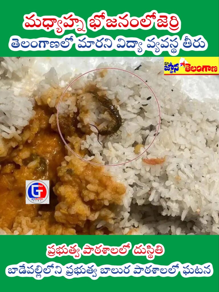 - మహబూబ్నగర్ జిల్లా జడ్చర్ల మండలం బాడేపల్లిలోని ప్రభుత్వ బాలుర పాఠశాలలో పెట్టిన మధ్యాహ్న భోజనంలో జెర్రి రావడంతో విద్యార్థుల ఆందోళన