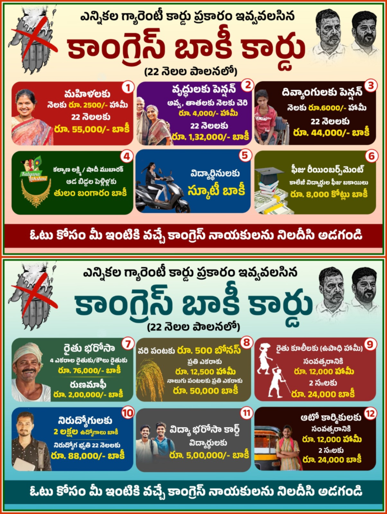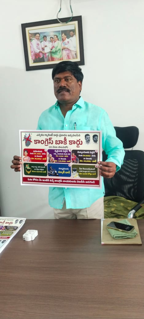 తెలంగాణ రాష్ట్రంలో అసెంబ్లీ ఎన్నికలకు ముందు కాంగ్రెస్ పార్టీ వంద రోజులలో ఆరూ గ్యారెంటీలు 420 హామీలు నెరవేరుస్తామని చెప్పి మేనిఫెస్టోలో పెట్టి 700 రోజులు గడిచిన ఇప్పటివరకు సంపూర్ణంగా ఒక్క హామీ కూడా నెరవేర్చకుండా తెలంగాణ ప్రజలకు బాకీ పడింది . రైతులను, రైతు కూలీలను, మహిళలను, యువకులను, నిరుద్యోగులనే కాకుండా అన్ని వర్గాల ప్రజలకు మోసం చేసినా కాంగ్రెస్ పార్టీ. రైతులకు సంపూర్ణంగా రుణమాఫీ చేయలేదనీ, రైతు భరోసాకు ఎగనామం పెట్టి, వడ్లకు బోనస్ ఇవ్వలేనీ అసమర్థ కాంగ్రెస్ ప్రభుత్వం సృష్టించిన యూరియా కొరతతో రైతులు మహిళలలు చిన్నపిల్లలు కుటుంబాలతో సహా గంటల తరబడి క్యూ లైన్ లో నిలబడి అనేక ఇబ్బందులు పడుతున్నారు.సరైన సమయంలో రైతులకు యూరియా అందక పంటల దిగుబడి తగ్గి రైతులు పంట నష్టపోవడం జరిగింది.పంట నష్టపోయిన రైతులకు కాంగ్రెస్ పార్టీ ఎకరాకు 25000 ఇవ్వాలని . నియోజకవర్గ వ్యాప్తంగా అనేక ధర్నాలు రాస్తారోకోలు చేసినప్పటికీ ఎలాంటి చలనం లేకపోవడం దురదృష్టకరం.కాంగ్రెస్ పార్టీ చేసిన మోసాలను అమలు చేయని హామీలను ప్రతి ఇంటింటికి వివరిస్తూ బాకీ కార్డులను పంపిణీ చేయాలని ఈ సందర్భంగా బిఆర్ఎస్ పార్టీ శ్రేణులకు సూచించారు నియోజకవర్గంలోని మున్సిపాలిటీ మరియు అన్ని మండల కేంద్రాలలో గ్రామాల్లో వార్డుల వారిగా ప్రతి నాయకుడు కార్యకర్త ప్రతి ఇంటికి వెళ్లి బాఖీ కార్డ్స్ ని పంపిణీ చేస్తూ విధిగా సెల్ఫీలు ఫోటోలు సోషల్ మీడియాలో అప్లోడ్ చేయాలని.రానున్న స్థానిక సంస్థల ఎన్నికలలో ఓటు కోసం వచ్చిన కాంగ్రెస్ పార్టీ నాయకులకు ప్రజలు బాకీ కార్డు చూపించి, హామీలను అమలు చేయాలని కాంగ్రెస్ నాయకులను నిలదీయవలసిందిగా కోరారు. రానున్న స్థానిక సంస్థల ఎన్నికలలో భాకీ కార్డ్స్ ను బ్రహ్మాస్త్రంగా ఉపయోగించి కాంగ్రెస్ పార్టీ నాయకుల ప్రచారాన్ని తిప్పి కొట్టాలని పార్టీ శ్రేణులకు సూచించారు